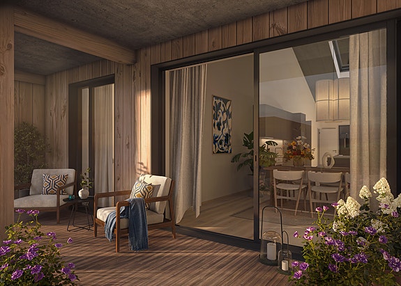 Arkitekten har vektlagt solide og naturlige materialer som gir et tidløst preg. Illustrasjon fra sydvendt balkong i B2.jpg