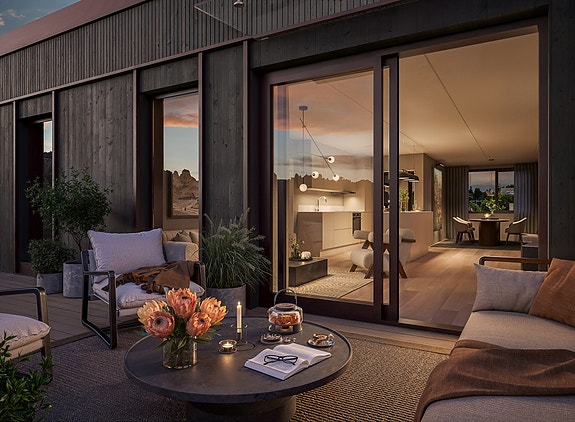 Flere av leilighetene får store innbydende takterrasser. Illustrasjon av leilighet J-401.