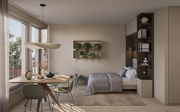 I prosjektet finner man flere 1-roms leiligheter som egner seg godt for førstegangskjøpere eller utleie. Illustrasjon av A2-H504.