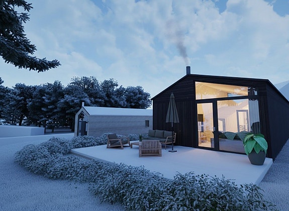 Minihuset er 13,15 meter langt og 6 meter bredt. Det er stående, brent trekledning i enten 12 eller 9 cm tykkelse, som leveres beiset eller ferdig malt. Utvendig målt yttervegger har U-verdi 0,22 og utvendig målt tak og gulv har U-verdi 0,18.