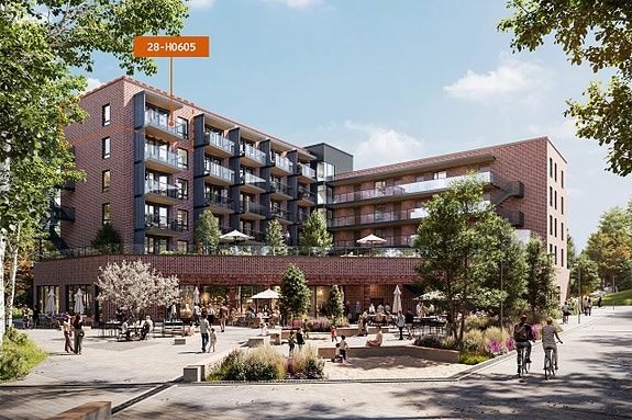 Hus 28 er det første du ser av Bergerløkka ned mot Billingstadsletta. Et moderne bygg med 41 leiligheter med en eksklusiv takhage. På gateplan kommer restauranter og serveringssteder som en del av det nye torget.