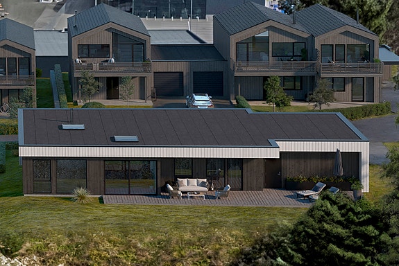 Bolig nr. 9: Nøkkelferdig enebolig på ett plan! Ca. 120 m² med åpen stue-og kjøkkenløsning, romslige soverom, TV-stue, terrasser og hagestue. Dobbelgarasje med sportsbod god plass til bil og fritidsutstyr.