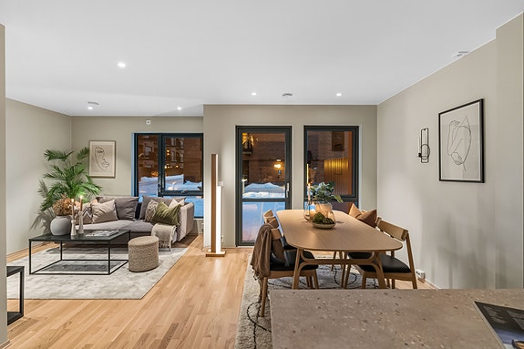 Lys og åpen stue i direkte tilknytning til kjøkkenet, som utgjør boligens naturlige samlingspunkt. Store vindusflater gir rikelig med dagslys. Gulvet leveres med hvitpigmentert trestavs eikeparkett og vannbåren gulvvarme som gir jevn og behagelig temperatur.