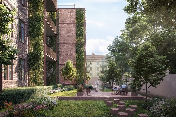 Fagerborg Sentral vil få en frodig og hyggelig bakgård, og en fin felles takterrasse. Denne vil både være solrik og ha en fantastisk utsikt mot vest, over nærområdet, og opp mot Holmenkollen.