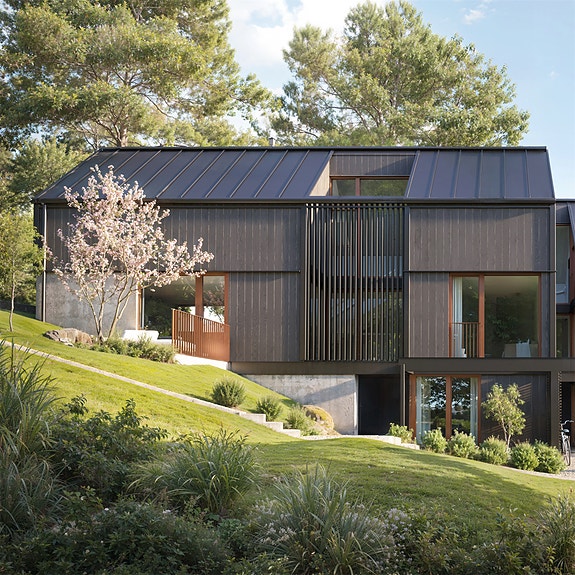 Boligen har utvendig kledning en dempet sort farge som gir et stilrent uttrykk. Innvendig 1-stavs parkett av type Harmoni Eik Norden, fliser i entré og på bad i type Stone Select Ivory (60x60 cm) med fuger lik flis for et sømløst uttrykk. Mosaikkfliser i dusjsoner.