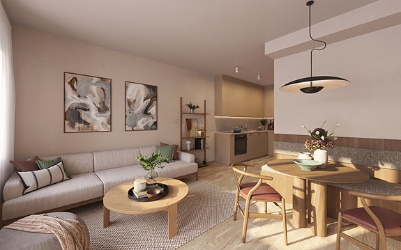 Velkommen til Torghagen og leilighet 3008 - Innbydende og arealeffektiv 2-roms. Illustrasjon fra lik leilighet. Romslig stue og tilbaketrukket kjøkkenløsning.