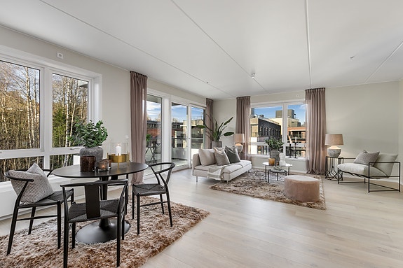 Leiligheten er lys og delikat med enstavs eikeparkett på gulv og store vindusflater som slipper inn mye lys og gir en god romfølelse. Leiligheten inneholder blant annet en romslig stue med åpen løsning til kjøkken. Kjøkkenet er moderne og stilrent med mørke fronter og lys laminat benkeplate. Av integrerte hvitevarer medfølger kjøl/frys, stekeovn, induksjonsplatetopp og oppvaskmaskin. Det er utgang fra stuen til en meget hyggelig vestvendt balkong med skjermet beliggenhet. Videre har leiligheten to gode soverom på 14 og 10 kvm, romslig og innbydende entrè, et delikat flislagt bad med vannbåren gulvvarme og en romslig bod på 6,2 kvm. I tillegg har leiligheten en sportsbod på ca. 5 kvm.