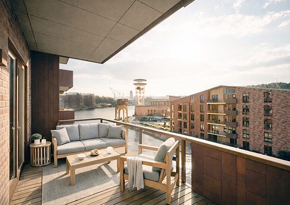 Elegante leiligheter med luftige balkonger og terrasser. På utsiden finner du et unikt bomiljø i historiske omgivelser. Prosjektet blir naturligvis bilfritt. Bilene får stå trygt plassert i parkeringskjelleren under bygget, hvor det blir heis opp til leilighetsplanet.