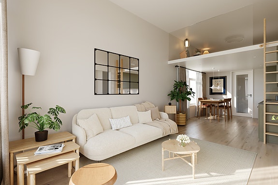 (Bildet er kun ment som illustrasjonsbilde - leiligheten leveres uten hems) Velkommen til denne unike og rålekre 2-romsleiligheten i Grønvolskvartalet