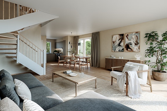 Åpen stue- og kjøkkenløsning med store vindusflater, gjennomtenkt planløsning og varme trematerialer - perfekt for både hverdagsliv og sosiale sammenkomster. Et hjem med rom for fleksibilitet, lys og livskvalitet - midt i Urtehagen på Brøset.