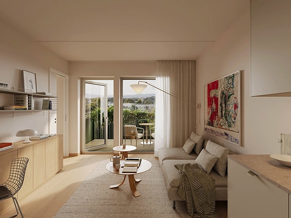 Interiørkonseptet "Soft" er valgt i leiligheten. Duse og naturlige toner i beige legger til rette for en avslappende og lun atmosfære og lar detaljer tre frem. I standard interiørkonsept får du kjøkken i en delikat beige farge sammen med laminat benkeplate i naturstein imitasjon. Kjøkkenet får integrerte hvitevarer fra Siemens og benkeventilator fra Bora. Armatur og øvrige detaljer i krom utførelse. Enstavs hvitpigmentert eikeparkett i en matt utførelse sammen med lyse gråbeige vegger skaper et dempet og rolig uttrykk i leiligheten.