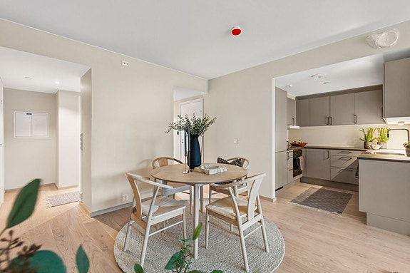Leiligheten holder en gjennomført og moderne standard med materialvalg av høy kvalitet. Kjøkkenet er levert av HTH og utstyrt med integrerte hvitevarer fra Siemens som gir et stilrent og funksjonelt uttrykk. Gulvene er belagt med 1-stavs eikeparkett, mens entréen har 60x60 cm fliser.