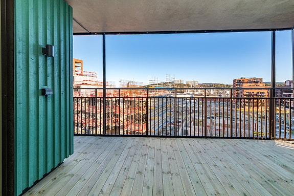 Stor hjørnebalkong med utgang fra stue.