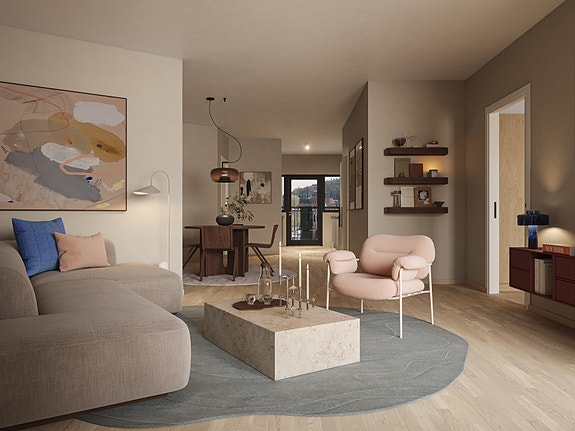 Våre leiligheter er utformet med tanke på praktisk bruk og tidløs eleganse. Du vil legge merke til de listefrie overgangene, som gir et strømlinjeformet uttrykk. Lys eikeparkett i alle rom gir en varm og innbydende atmosfære samtidig som den er holdbar og lett å vedlikeholde.