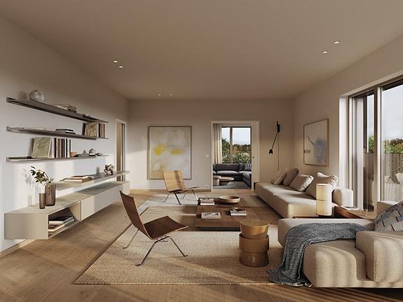 Leilighetene har store vindusflater og gjennomtenkte planløsninger som gjør det enkelt å innrede i flere soner. Illustrasjon, avvik vil forekomme