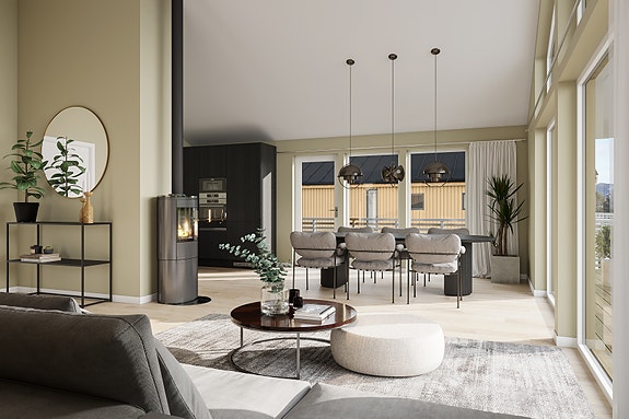 - Åpen stue/kjøkken med skråtak og store vinduer
