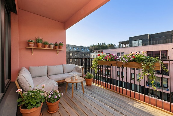 Flott vestvendt balkong med god plass til utemøbler. Bildet er AI generert. Feil vil forekomme