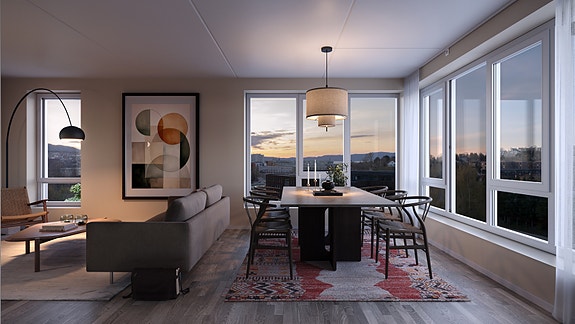 Leiligheten ligger i byggets 8. etasje og byr på flotte solforhold og god utsikt. Med sin gjennomgående planløsning og attraktive endebeliggenhet får boligen ekstra gode lysforhold og en luftig romfølelse.