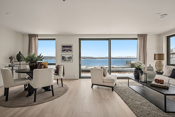Området er idyllisk med lite trafikkmed umiddelbar nærhet til sjøen. Leiligheten har fantastiske solforhold på ettermiddag og kveld, og en sjøutsikt de fleste bare kan drømme om.