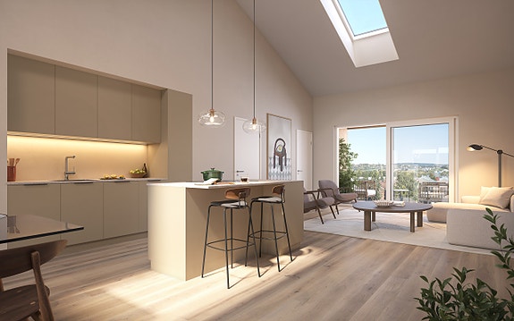 Stue- og kjøkkenløsningen er gjennomgående og lys med vindusflater i to retninger. Stue/ kjøkken delen vil få et luksuriøst preg med takhøyde på rundt 4 meter og ekstra lysinnslipp fra 2 store takvinduer. Her er det god plass til både langbord og sofagruppe. Kjøkkenet leveres med kjøkkenøy som skaper et naturlig samlingspunkt i rommet.