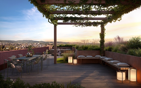 I tillegg til din private uteplass kan du nyte ettermiddagssola på en av de hyggelige takterrassene, hvor du blant annet er omgitt av planter og sittegrupper. Terrassene er inndelt i forskjellige soner, og det blir god plass både for trening og mindre arrangementer, gjerne i le under en pergola. Opphøyde plantekasser med jord vil stå klare av de som vil dyrke eget. I tillegg til oppbevaringsmuligheter i leiligheten, blir det levert en praktisk kjellerbod og det blir også rikelig med sykkelparkering, både ute og inne.