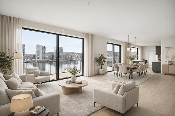 Romslig og fin stue med masse lys og utsikt! Bildet er digitalt møblert med AI for illustrasjonsformål.