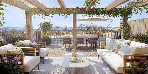 Et av prosjektets høydepunkter er takterrassen, hvor det er skapt et helt eget landskap i høyden. Det er lagt stor vekt på å bruke kvalitetsmaterialer som står godt mot vær og vind, og som samtidig gir en lun og innbydende atmosfære. Terrassene erinnrammet av grønne elementer alt fra klatreplanter til blomstrende busker i plantekasser, noe som gir en følelse av nærhet til naturen selv i høyden. Dette er ikke bare en takterrasse, men en hage til alle beboerne med enestående utsikt over byens tak og horisont. Det er lagt opp til store fellesarealer på takene, samt egne private parseller. De private parsellene skjermes med levegger og klatreplanter, slik at de får en trivelig og intim atmosfære.