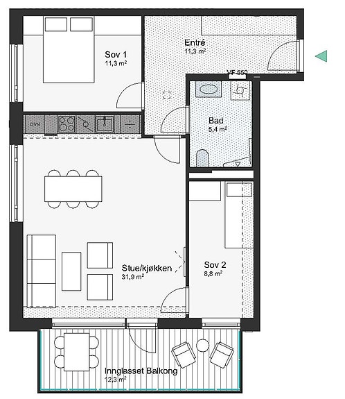 Hjørneleilighet med åpen stue/kjøkkenløsning. To soverom, ett bad og entré med plass til oppbevaring. Direkte adkomst fra stuen til østvendt balkong. Leveres standard som 3-roms, men ved planvalg kan leiligheten gjøres om til 2-roms med kjøkkenøy og platetopp. Se plantegninger.