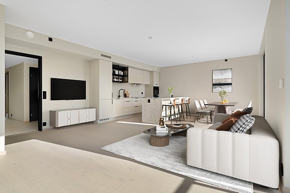 Dette er en romslig toppleilighet som inneholder gang, med mulighet for skapinnredning flere steder, samt adkomst til boligens 3 soverom, teknisk rom / bod og boligens største bad. Masterbedroom er meget romslig og inneholder både walk-in closet og eget bad. Gangen leder deg så inn i hovedoppholdsrom som er en åpen stue- og kjøkkenløsning, der kjøkkenet ligger tilbaketrukket og med øy. Stuen har god plass til både spisestue og sofasone. Fra stuen adkomster via skyvedører ut til terrasse på 20 kvm, samt til balkong på 4,5 kvm.