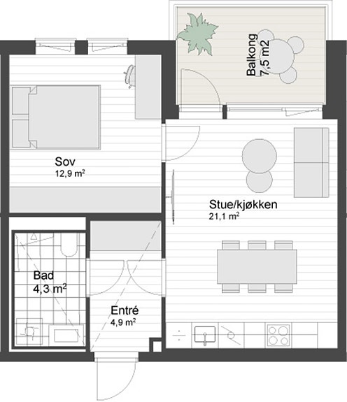 Åpen stue/kjøkkenløsning med takhøyde på 2.6 meter og store vinduer som slipper lyset inn. Pen og tidsriktig lys en-stavs eikeparkett, og lys innredning og fargedekor. Balansert ventilasjon med varmegjenvinning som sørger for godt inneklima og lave kostnader for oppvarming. Vi tilbyr nå Deleie i samarbeid med Coo til alle våre boligkjøpere. Ta kontakt med selger for mer informasjon!