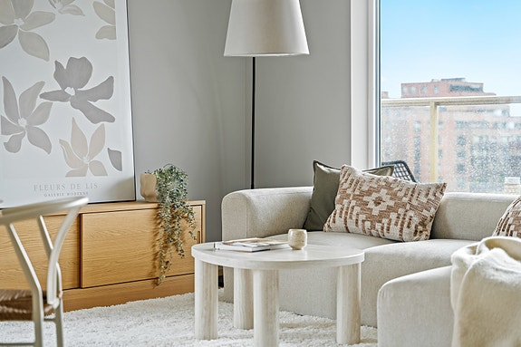Hjørneleilighet med 3 soverom, åpen stue/​kjøkken, 2 bad og sydvendt balkong.
