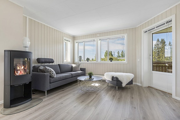 Stue: Rikelig med vindusflater som gir mye lys inn i rommet. Utgang til stor balkong/terrasse. Tak overbygget også i 2 etg. Stuen er også utstyrt med en tidløs peis-ovn. Her er det lett å møblere og gjøre stuen til et meget trivelig oppholdsrom.