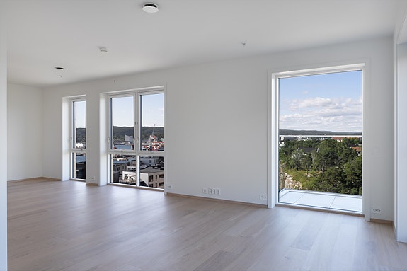 Leiligheten har en åpen og sosial stue- og kjøkkenløsning med god plass til både spisebord og sofagruppe. Store vindusflater gir rikelig med naturlig lys og skaper en luftig atmosfære. Det er tre soverom med ulike størrelser, hvor hovedsoverommet har plass til dobbeltseng og garderobeløsning, mens de to andre rommene egner seg godt som barnerom, gjesterom eller kontor.