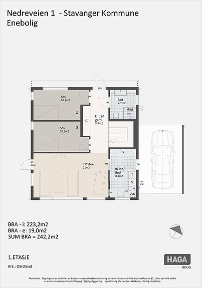 1.Etasje: BRA: 86 kvm inkl. carport på 21 kvm.