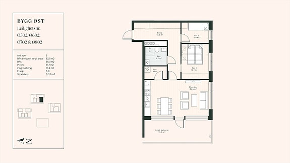 Sørvestvendt 3-roms hjørneleilighet i 7. etasje med romslig innglasset balkong på ca. 16 kvm. Leiligheten har god planløsning med åpen stue- og kjøkkenløsning og store vindusoverflater som bidrar til en luftig romfølelse. Leiligheten har to soverom, bad/vaskerom, romslig entré og innvendig bod.