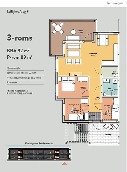 Det monteres panelovner i soverom og stue/kjøkken. I entré og bad leveres det varmekabler. Ventilasjonsaggregat med balansert ventilasjon.