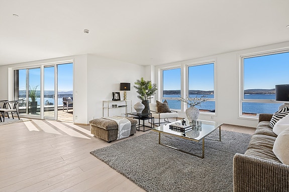 Leiligheten har videre en luftig og fin planlønsing med et stort, deilig oppholdsrom med fantastisk utsikt til sjøen. Det store kjøkkenet ligger i en egen del av rommet, har flott plass til langt spisebord og det er enkel adkomst til takterrassen.