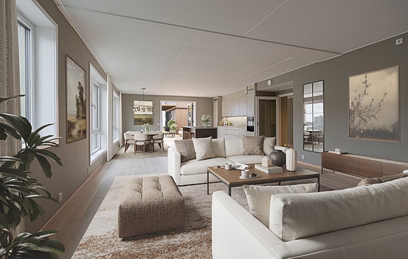 B601 Lys og lekker stue med oppgradert kjøkken og utgang romslig terrasse. Bildet har digital møblering