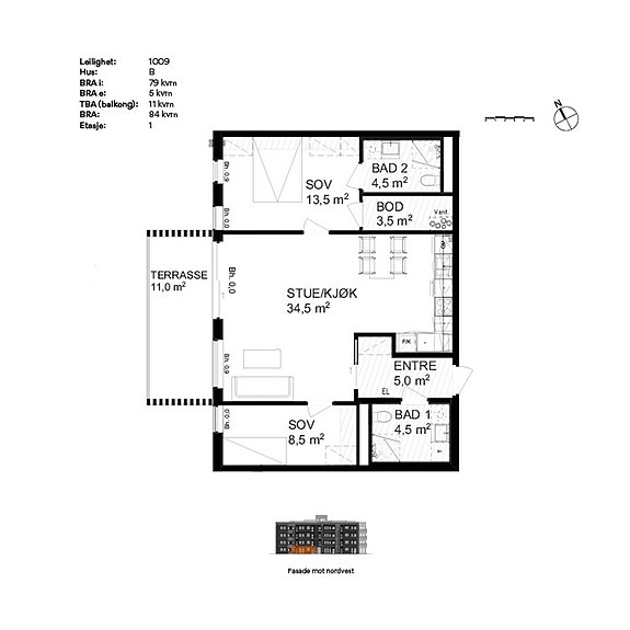 Dette bygget består av 33 stk. to, tre og fireroms leiligheter fra 44-110 m2. Alle med balkong eller terrasse på bakkeplan. Noen av leilighetene i bygget har privat takterrasse. Gode planløsninger og store vindusflater gir godt med lysinnslipp. Det er heisadkomst til alle etasjeplan og en felles flott takterrasse på toppen. Alle 3-roms leilighetene har p-plass inkludert. Alle leilighetene har en sportsbod i forbindelse med garasjekjeller.