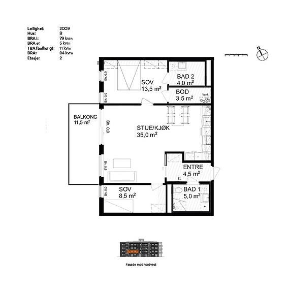 Dette bygget består av 33 stk. to, tre og fireroms leiligheter fra 44-110 m2. Alle med balkong eller terrasse på bakkeplan. Noen av leilighetene i bygget har privat takterrasse. Gode planløsninger og store vindusflater gir godt med lysinnslipp. Det er heisadkomst til alle etasjeplan og en felles flott takterrasse på toppen. Alle 3-roms leilighetene har p-plass inkludert. Alle leilighetene har en sportsbod i forbindelse med garasjekjeller.