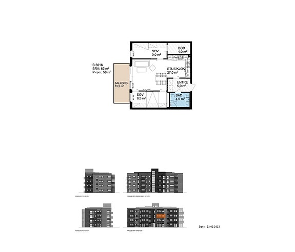 Dette bygget består av 33 stk. to, tre og fireroms leiligheter fra 44-110 m2. Alle med balkong eller terrasse på bakkeplan. Noen av leilighetene i bygget har privat takterrasse. Gode planløsninger og store vindusflater gir godt med lysinnslipp. Det er heisadkomst til alle etasjeplan og en felles flott takterrasse på toppen. Alle 3-roms leilighetene har p-plass inkludert. Alle leilighetene har en sportsbod i forbindelse med garasjekjeller.