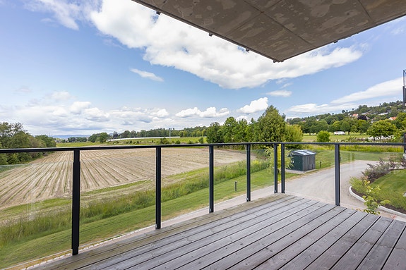 Boligen har to balkonger. En med utsikt mot nord og jordbærmarkene til Borgestad Gård.