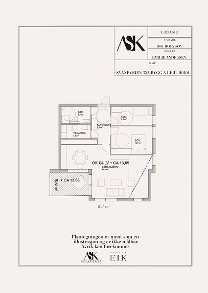 Leiligheten ligger i 1.etg og er målt på tegning til 84,5 kvm og leveres med 2 soverom, stue/kjøkken, vaskerom/bod, bad med toalett og dusjhjørne og åpen korridor.
