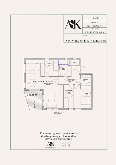 Leiligheten ligger i 1. etg og er målt på tegning til 105 kvm og leveres med 2-3 soverom, stue/kjøkken, vaskerom/bod, bad med toalett og dusjhjørne, sekundær toalett og åpen korridor.