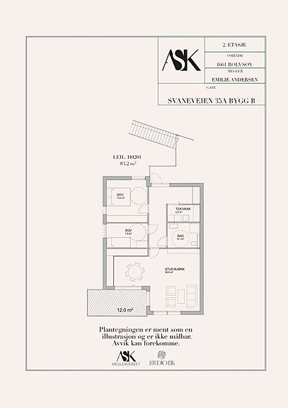 Leiligheten ligger i 2.etg og er målt på tegning til 84,5 kvm og leveres med 2 soverom, stue/kjøkken, vaskerom/bod, bad med toalett og dusjhjørne og åpen korridor.