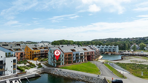 Gang, 3 soverom, bad/wc, bad/wc/vaskerom, teknisk rom og stue / kjøkken i åpen løsning med utgang til vinkelbalkong.