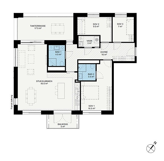 Badene leveres som prefabrikkerte våtromsmoduler (badekabin). Enkelte bad kan bli plassbygd. Badene leveres med fliser i størrelse ca. 60x60 cm på vegg og gulv. Farge på flis kan avvike fra illustrasjoner. Baderomsinnredning leveres med skuffer, med helstøpt servant. Ettgreps blandebatteri av typen Tapwell ARM071 krom eller lignende. På bad med heldekkende benkeplate leveres det rektangulært speil med LED lys striper. Der hvor det kun leveres servantskap vil speil ha lik bredde som servantskap. Det leveres i hovedsak rette innadslående dusjvegger i klart herdet glass av typen INR Angel eller tilsvarende. Regndusj leveres montert på vegg, av typen Tapwell EVO TVM7200 eller tilsvarene. Line sluk eller tilsvarene. Det leveres vegghengt toalett i hvitt porselen med to-trinns vannspyling og innebygd sisterne.