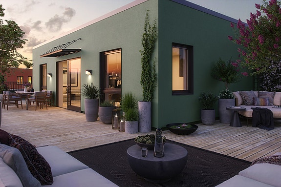 Leiligheten har en meget sosial god planløsning som gjør at boligen vil passe for de aller fleste familiesituasjoner. Og den private takterrassen på 90 m² strekker seg rundt tre av boligens yttersider - her får du sol fra morgen til kveld!