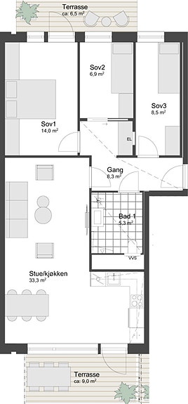 Det vil bli levert vannbåren via radiatorer eller elektrisk oppvarming med panelovner. På baderom leveres det varme i gulv.