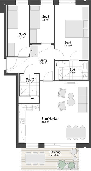 Leiligheten bygges med lys en-stavs eikeparkett, generøs takhøyde og store vindusflater. Balansert ventilasjon sørger for godt inneklima og lave kostnader til oppvarming. Konsept på interiør har vi kalt Nordisk, og inkluderer veggfarger, kjøkkenfronter og -håndtak og benkeplater. Konseptet er tegnet ut av WOOD arkitektur + design. Denne leiligheten kan kjøpe garasjeplass for kr. 595 000 inkl. lader til EL-bil. Leiligheten kvalifiserer til Grønt Boliglån, kontakt selger for mer informasjon.